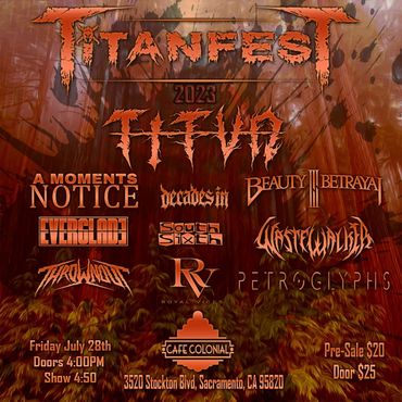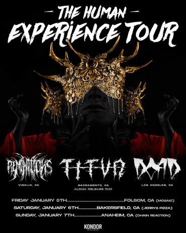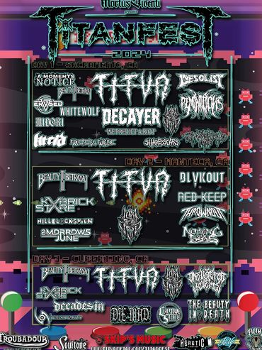 TITVN came out swinging with their first show being a (now) annual festival they put on called "TITANFEST" with over 200+ tickets sold. The following year in 2022 their first show of the year was headlining Goldfield Midtown, a 300 capacity room they sold out. With that being a huge hit they got the opportunity to play for bands such as Upon A Burning Body, Avoid, Eyes Set To Kill, Unearth, Traitors, Decayer, Vulvodynia, Signs of the Swarm, VCTMS and more. 2023 was the return of "TITANFEST" with them pushing the boundaries of overselling the changed venue 201/150 and heading out on their first tour covering California all the way to Haltom City, Texas. 2024 got to see the full length album drop "The Human Experience" that currently sits at 620,000 streams across all 10 tracks. They rolled out 5 tours in 2024 and a few of those being co-headlining "Bittersweet festival" in Modesto, CA with over 400+ attendees. Then came back with their annual "TITANFEST" for 2024 and it was MASSIVE. They took it from 1 room & 10 bands to 3 days, 3 different cities and 28 bands. Day 1 oversold 434/350 in Sacramento, Manteca, CA hitting 120+ attendees and day 3 being in Cupertino, CA with over 100+ attendees. For 2025 TITANFEST was 3 days again but this time all 3 in Sacramento with 25 acts and a "zero" day that is all for the kids at "School Of Rock". Zero Day was a FREE TITANFEST day that brought 200+ people on in. Day 1 was stacked with Metalcore, Pop Punk & Hardrock generating over 400+ attendees and the finale 2nd day of deathcore and hardcore bands slamming 700+ attendees to the event. Over 1,300+ people attended TITANFEST 2025. TITVN had their first headline show of 2025 in Roseville, CA at Goldfield, Roseville putting 439 in the room. Over selling what they did for their headline fest the year prior.